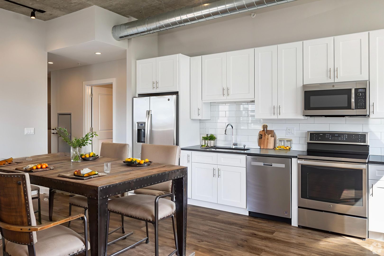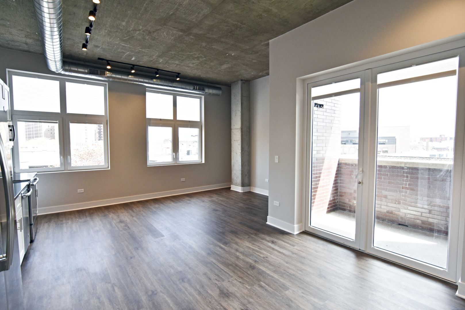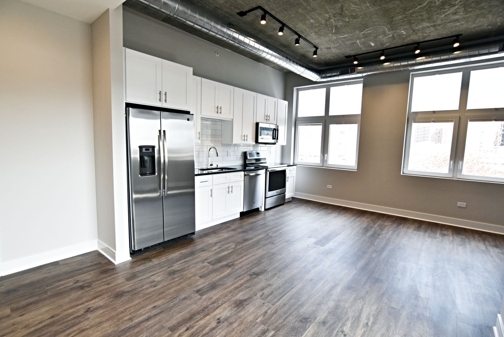 LVT flooring, high ceilings and track / recessed lighting finish this newly constructed unit.