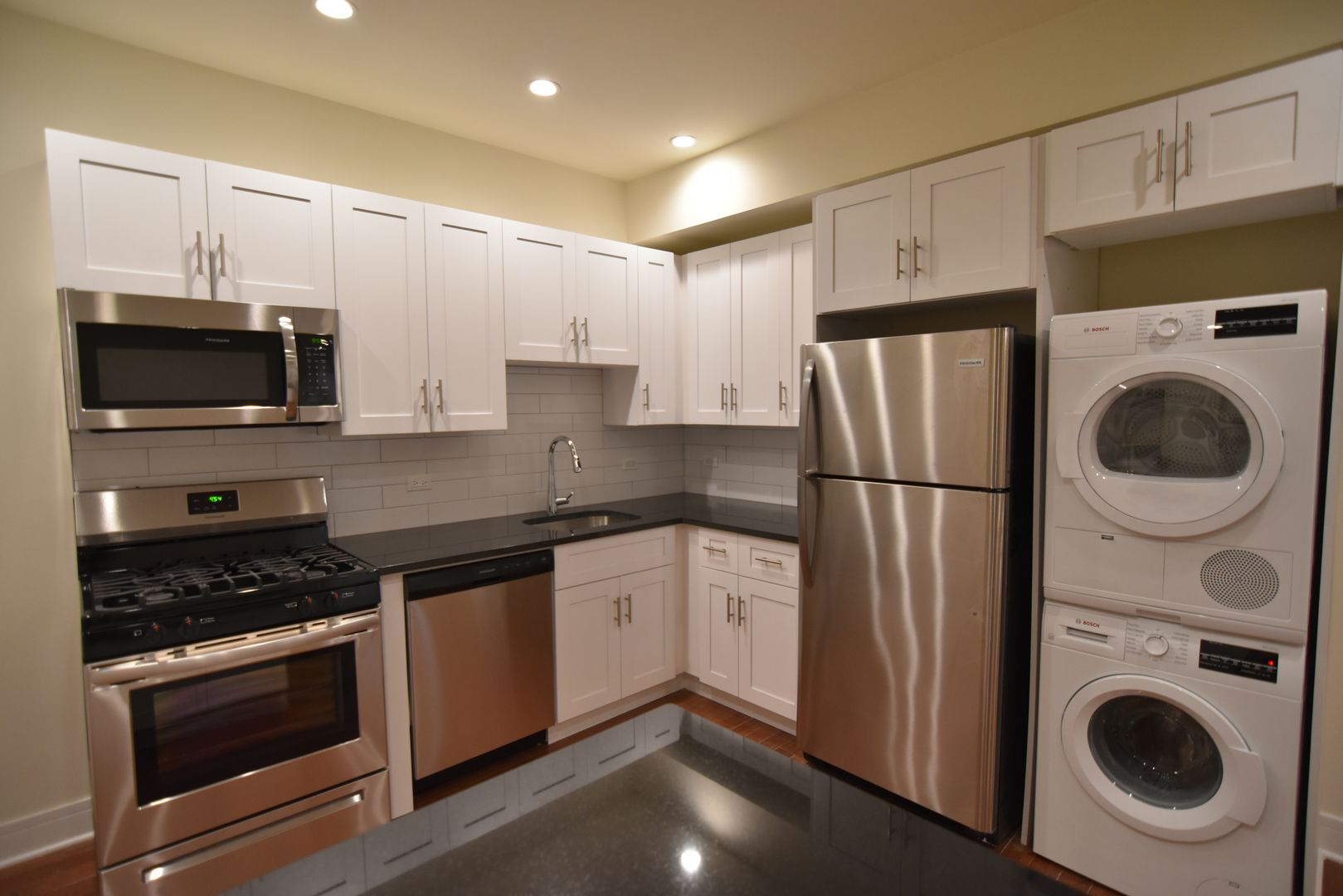 The unit has 2 large bedrooms each with nice big windows and plenty of room for queens sized beds and storage. The flooring has been replaced with new hardwood throughout. New HVAC, new modern full bath and fully equipped with in unit washer & dryer.