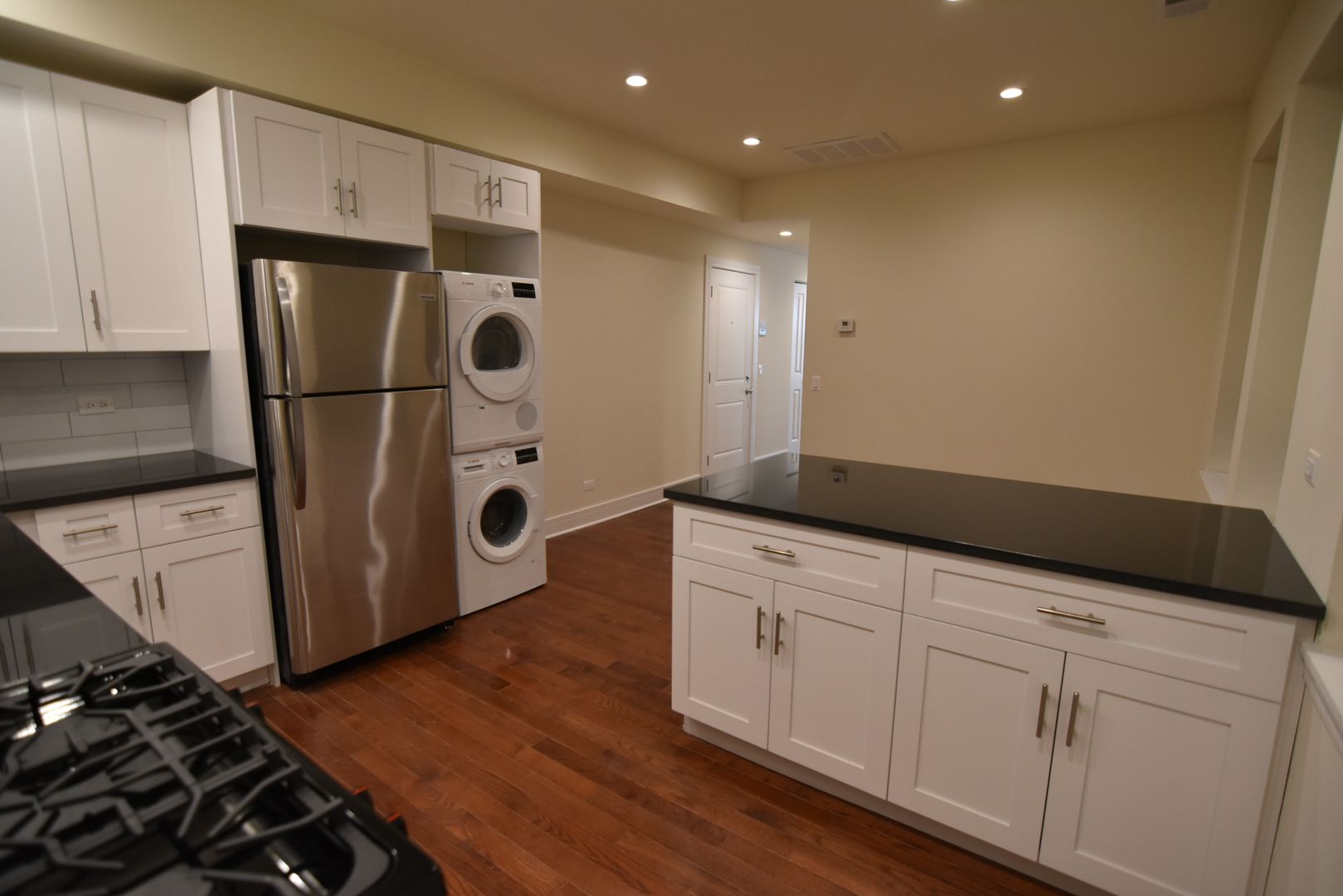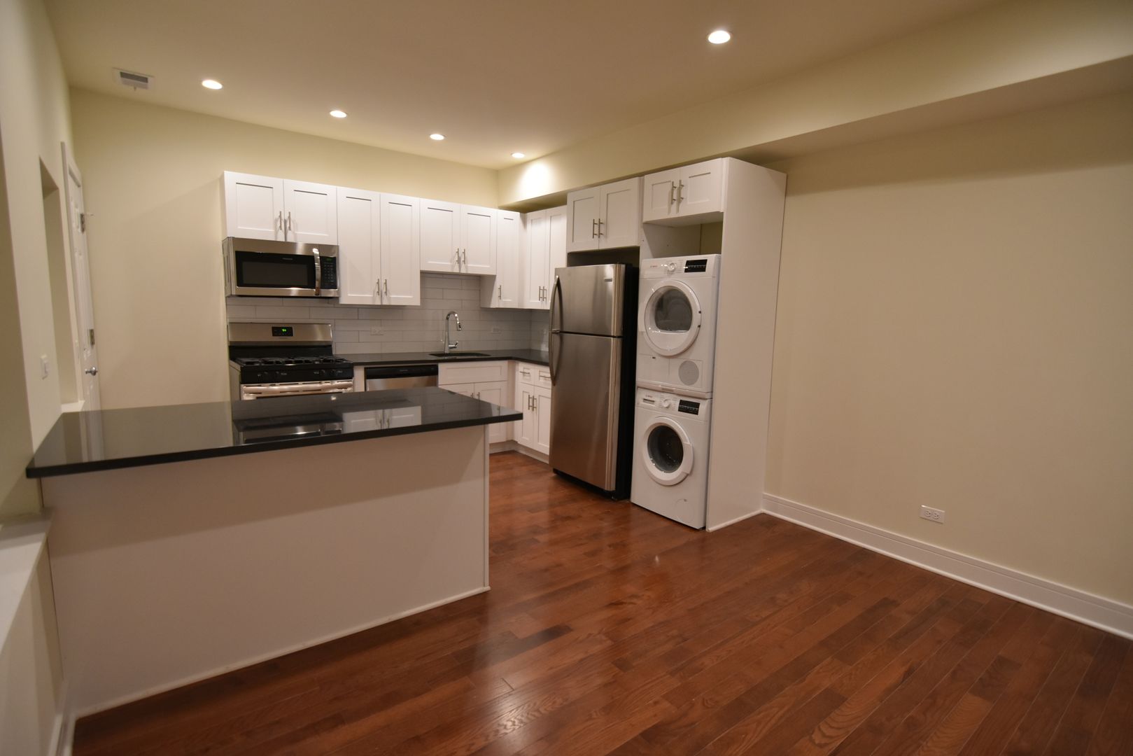 The front living space has big windows looking east, flushed with natural light. New modern kitchen with stainless steel appliances, dishwasher and big peninsula, perfect for meal prep, is accompanied by a dedicated dining or home office area.
