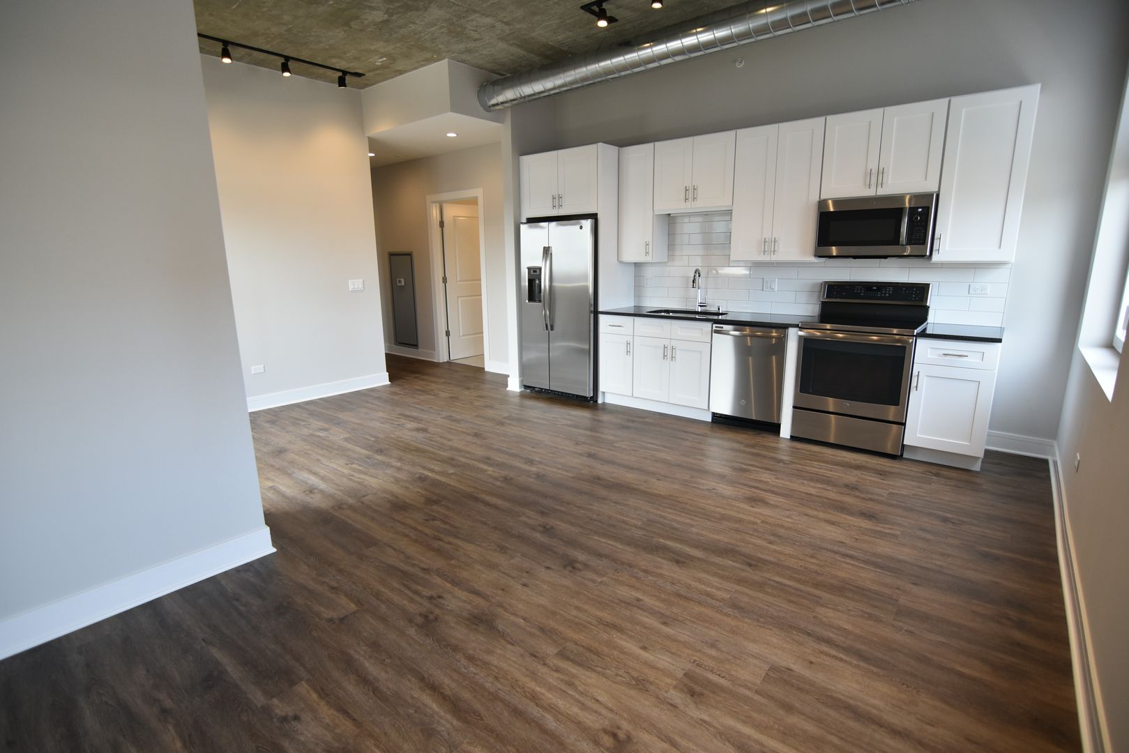LVT flooring, high ceilings and track / recessed lighting finish this newly constructed unit.