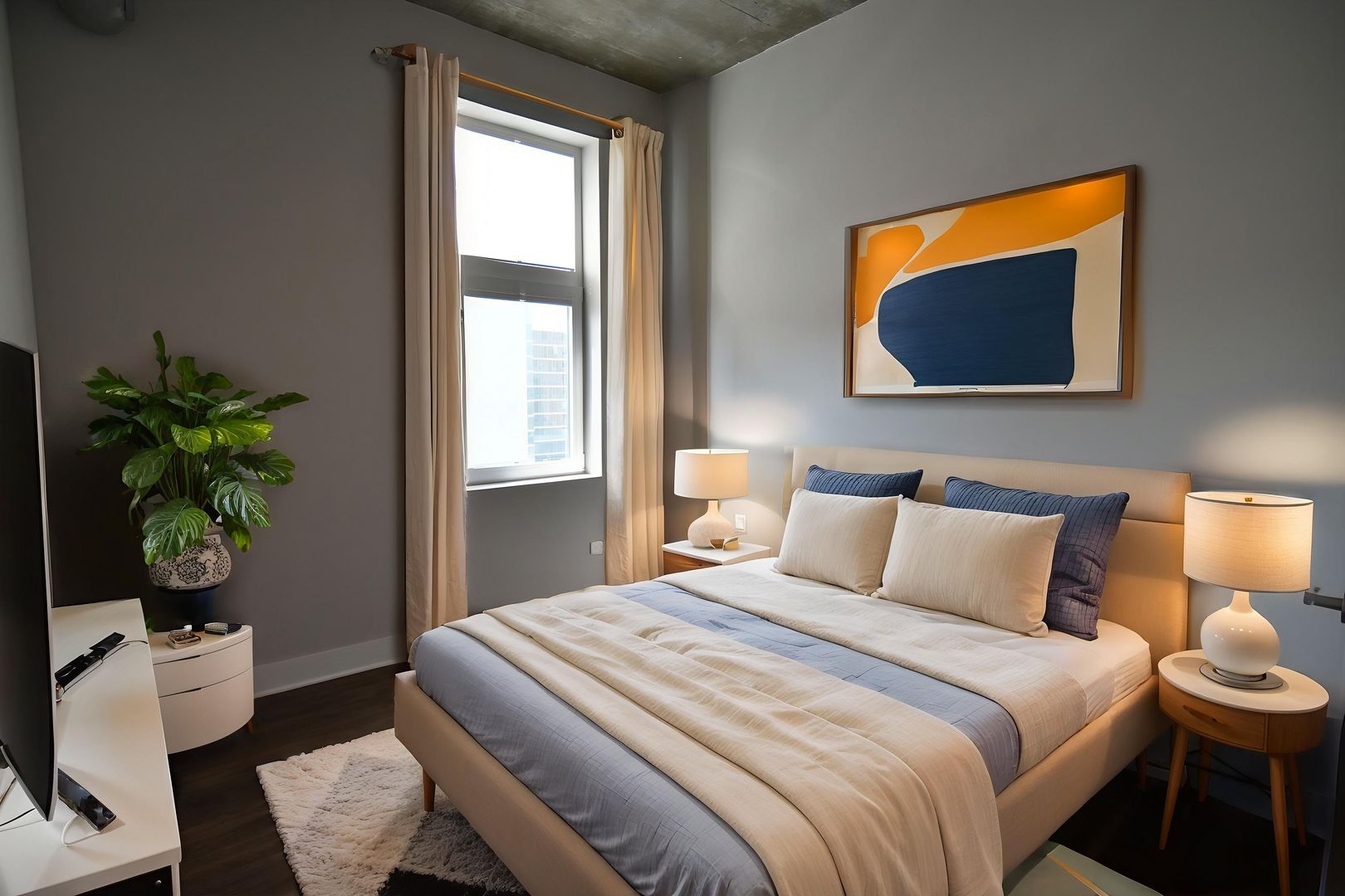 Each bedroom has great natural light! The master suite will accommodate a queen sized bed and has a good size closet and modern ensuite bath. The living room has a small private balcony that faces the city skyline. Great natural light.