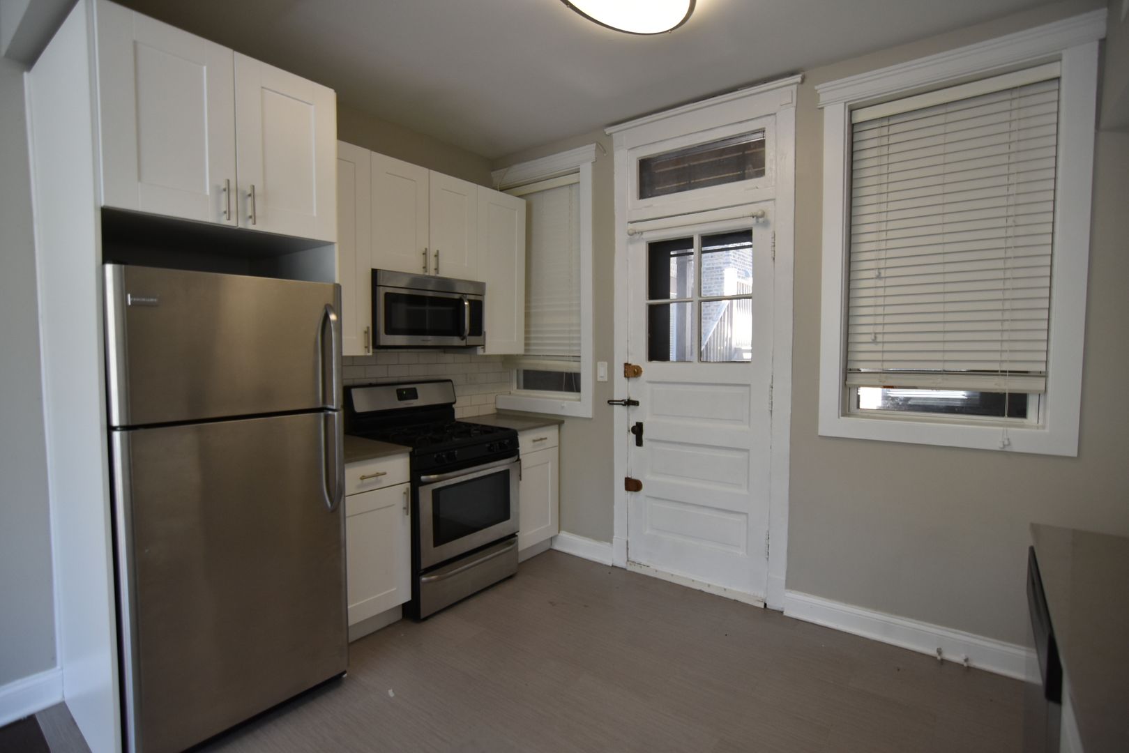 The combined Living / kitchen dining, faces south, it has great light and an updated kitchen with stainless steel appliances. There is a small back porch area (Shared) off the kitchen.