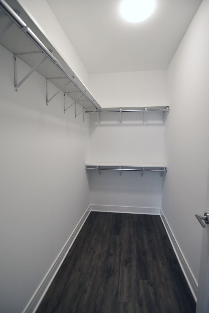 This cozy 1 bedroom unit is on the south side of the building and set on our top floor. Take in the lovely city skyline views from your private balcony off the main living space. The king size bedroom will easily accommodate a king bed plus other furniture and the walk in closet is huge!